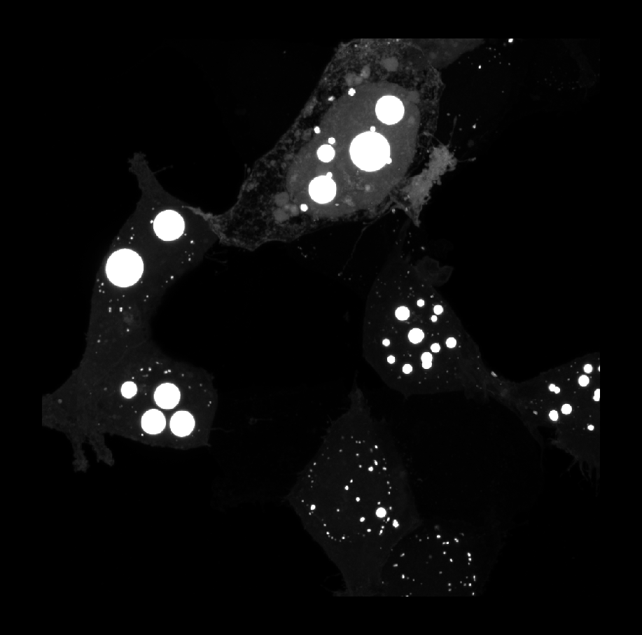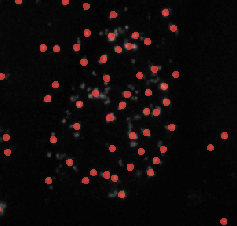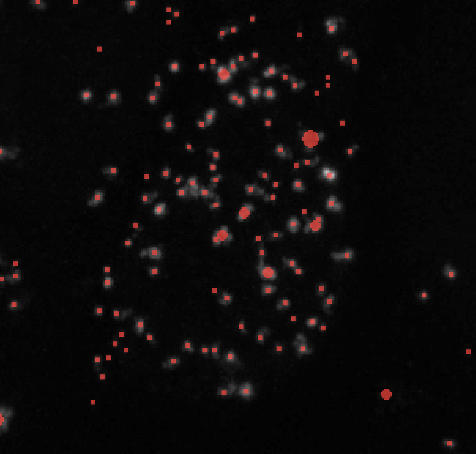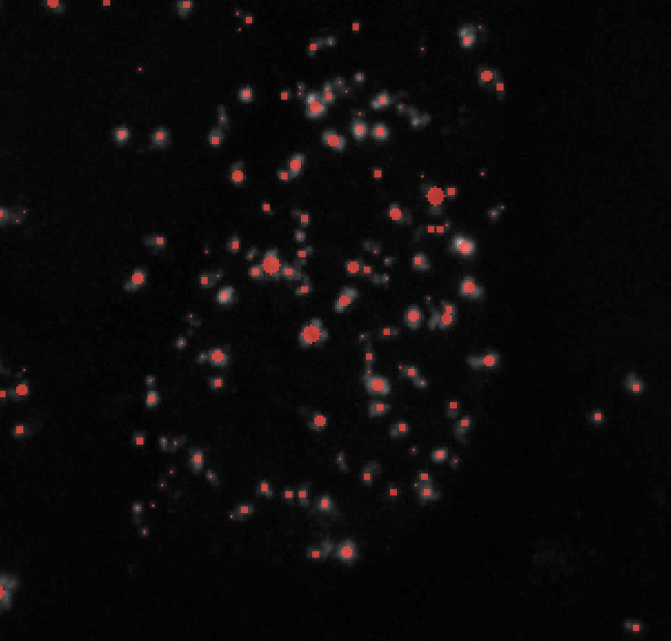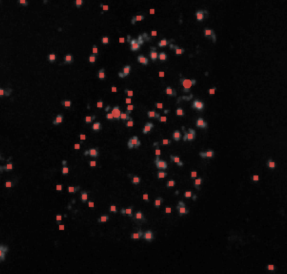 skimage’s blob detection methods segment puncta in a specific range of sizes and will always create circular labels. These methods are ideal for quickly labeling circular puncta as shown in the image below: